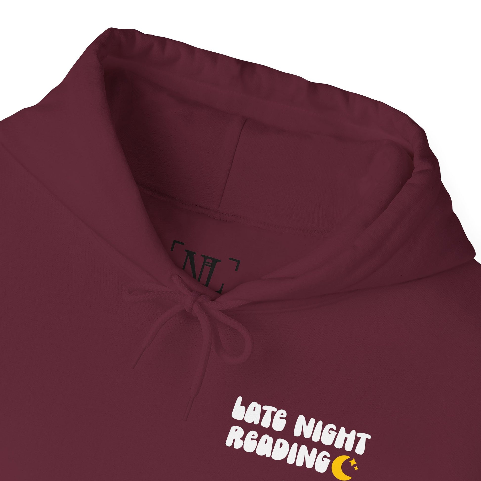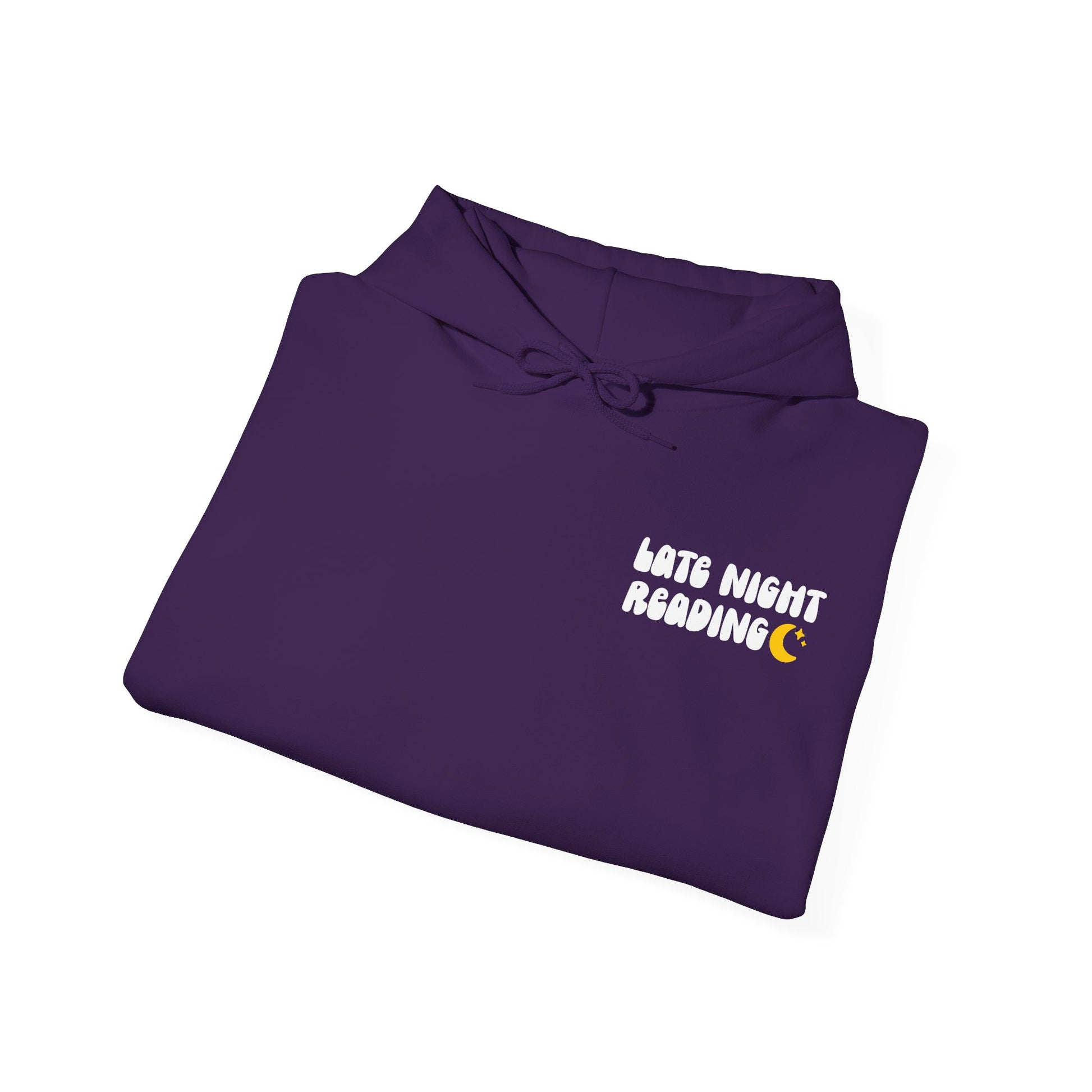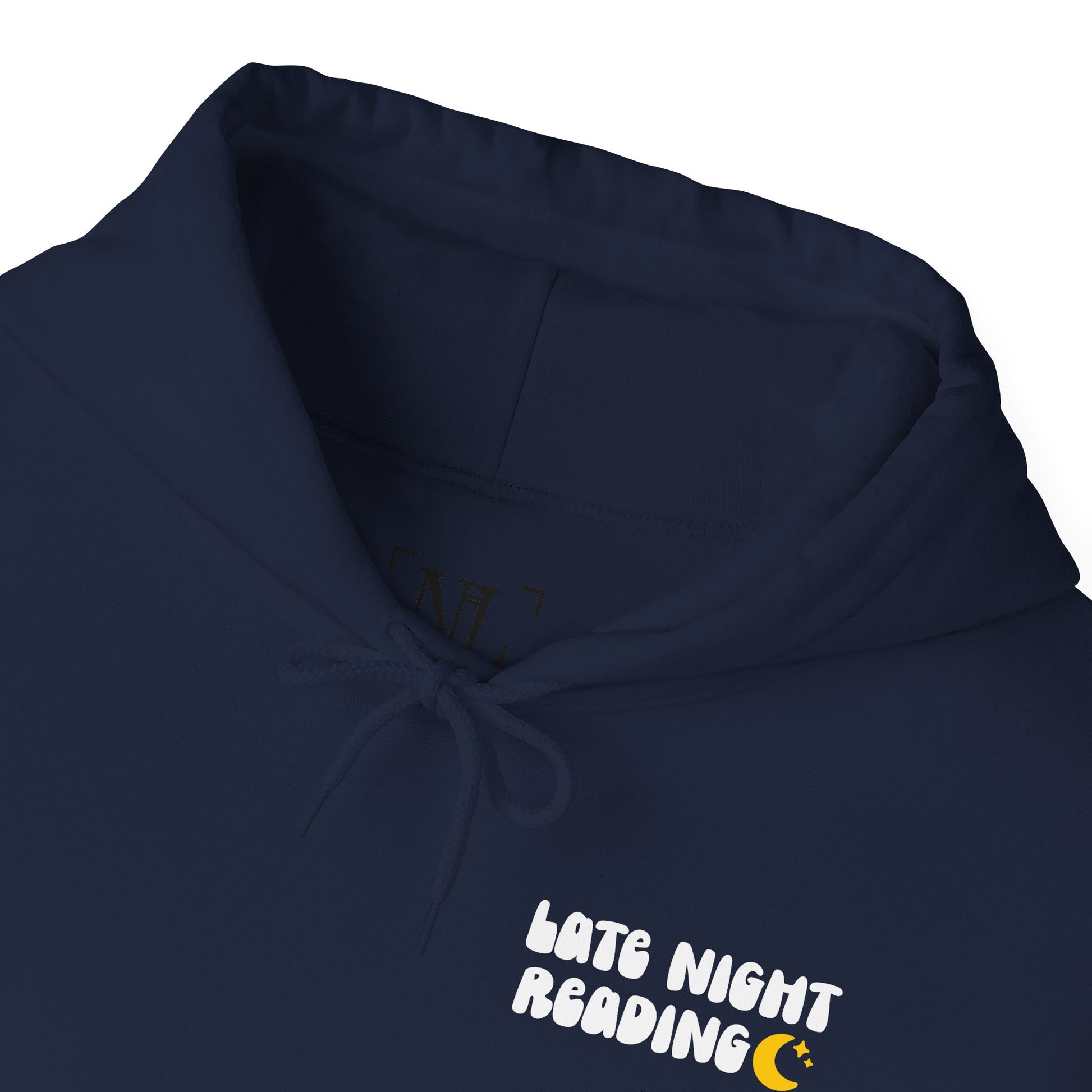 Late Night Reading Hoodie — Cozy Book Lover Pullover with Moon & Books Graphic (White Text)