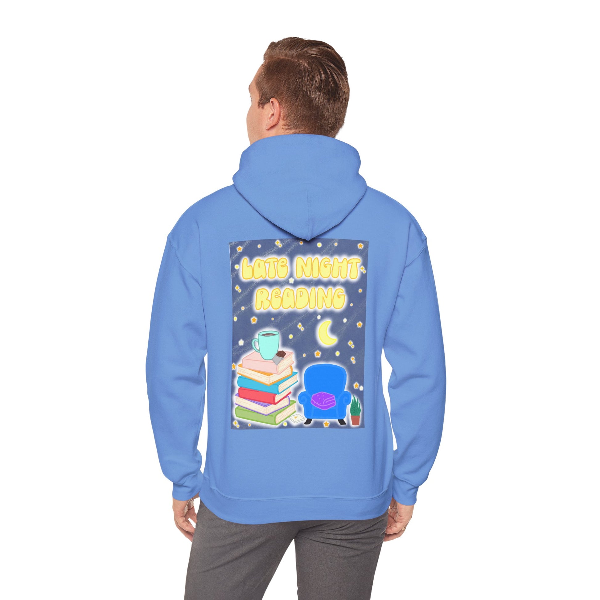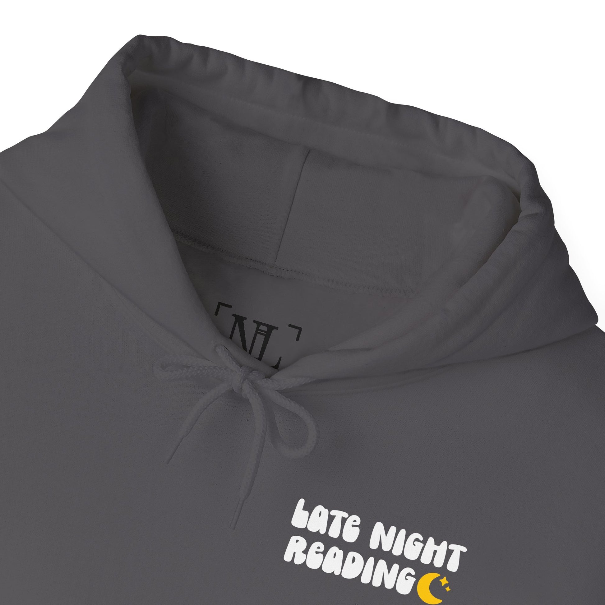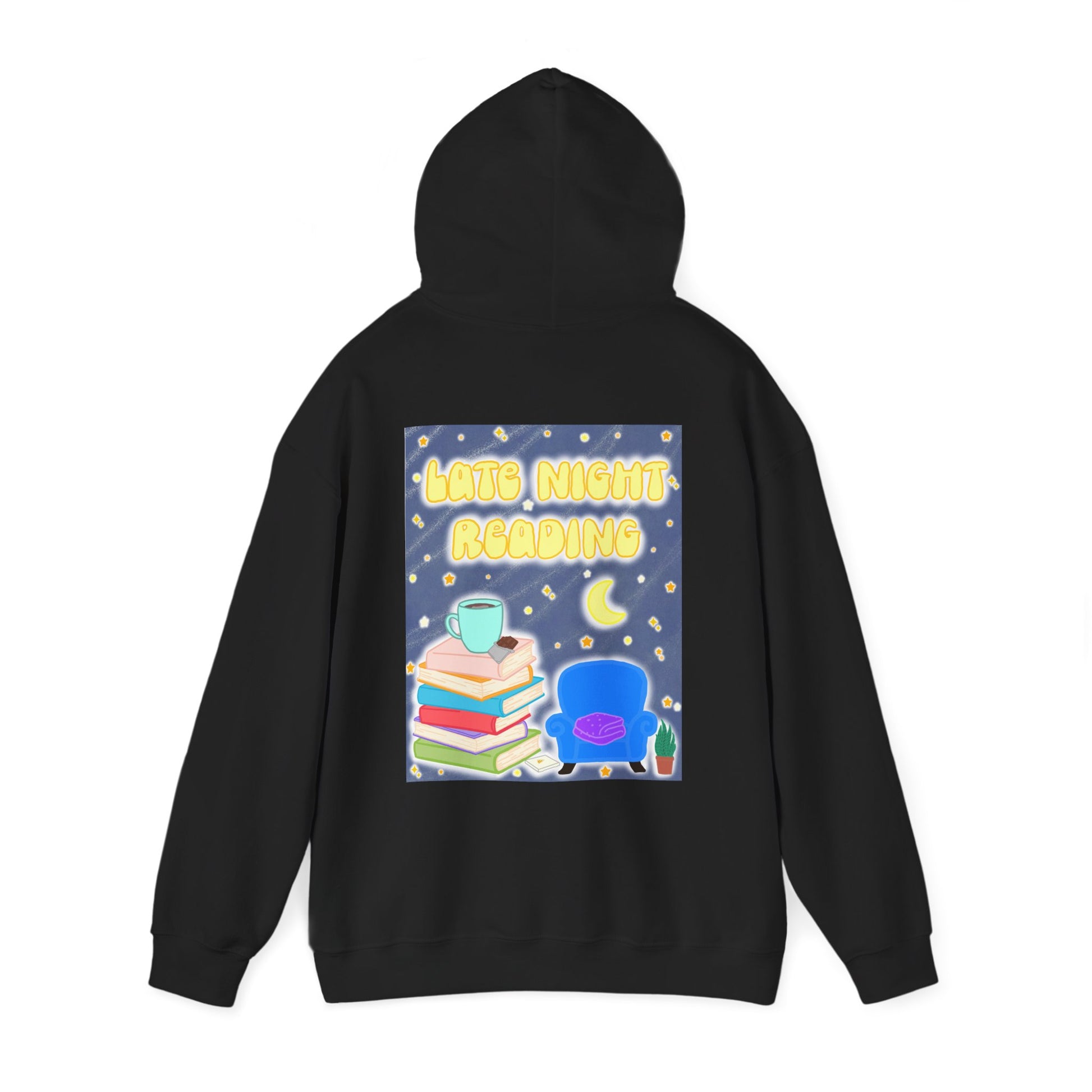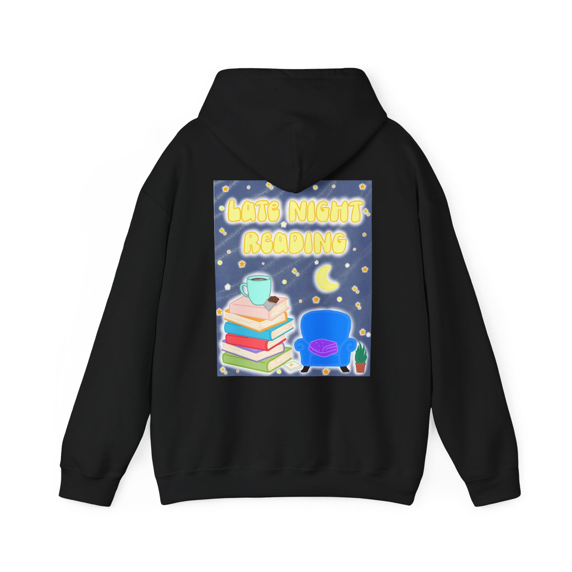 Late Night Reading Hoodie — Cozy Book Lover Pullover with Moon & Books Graphic (White Text)