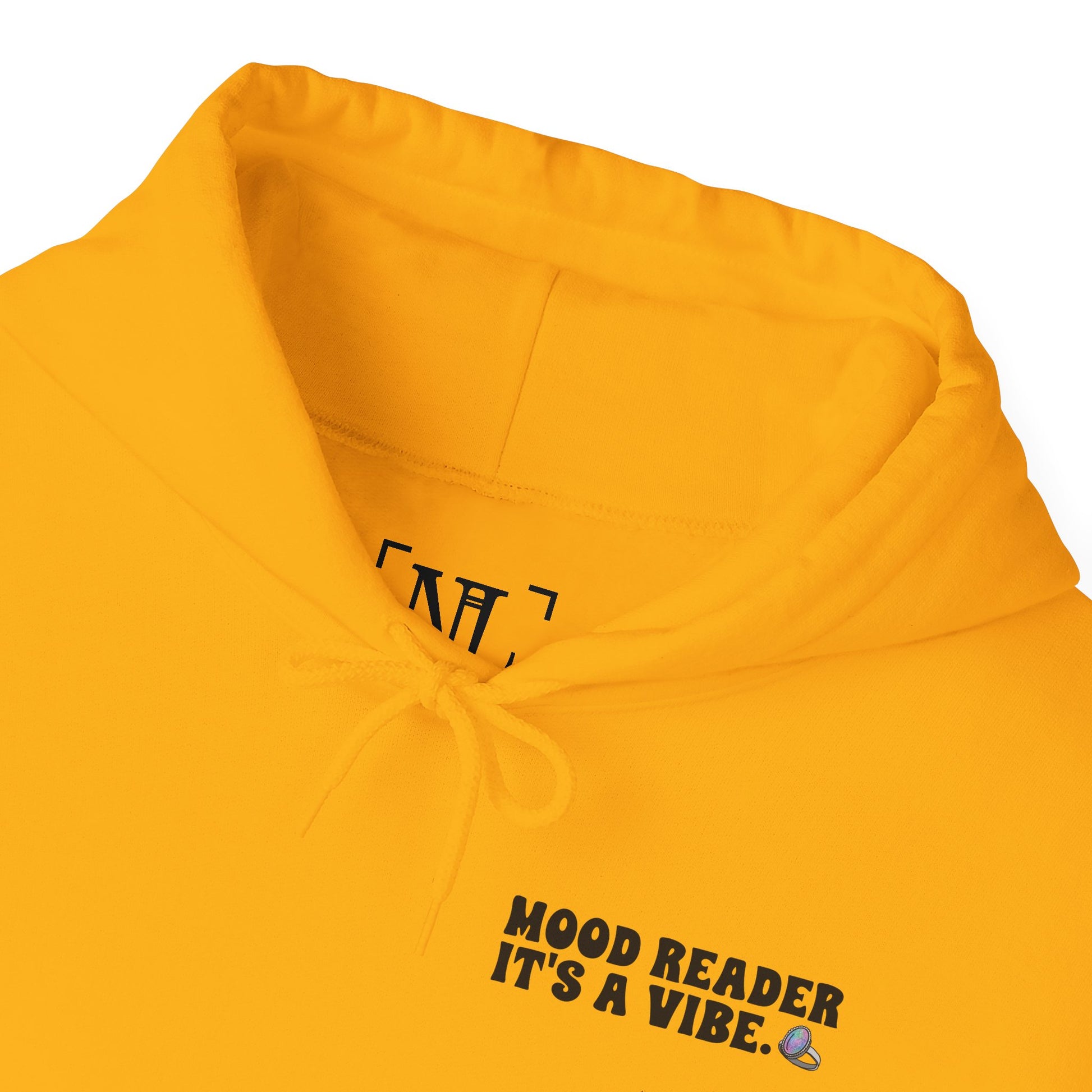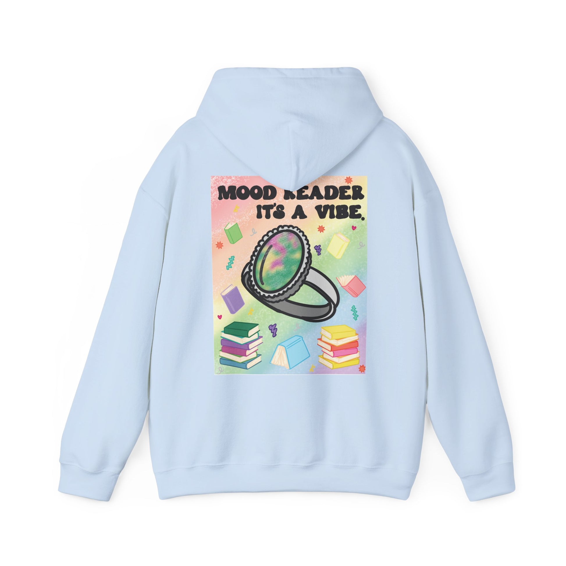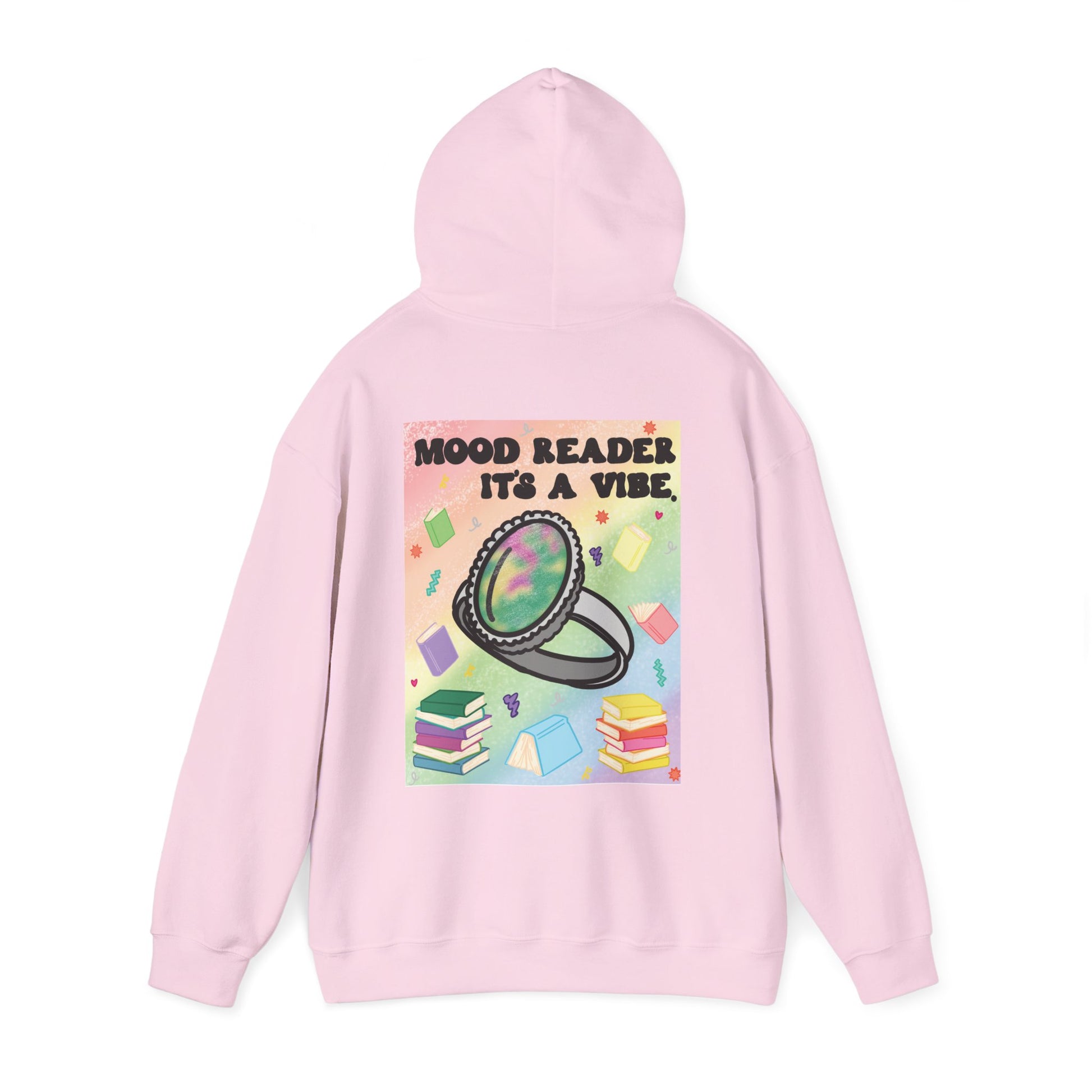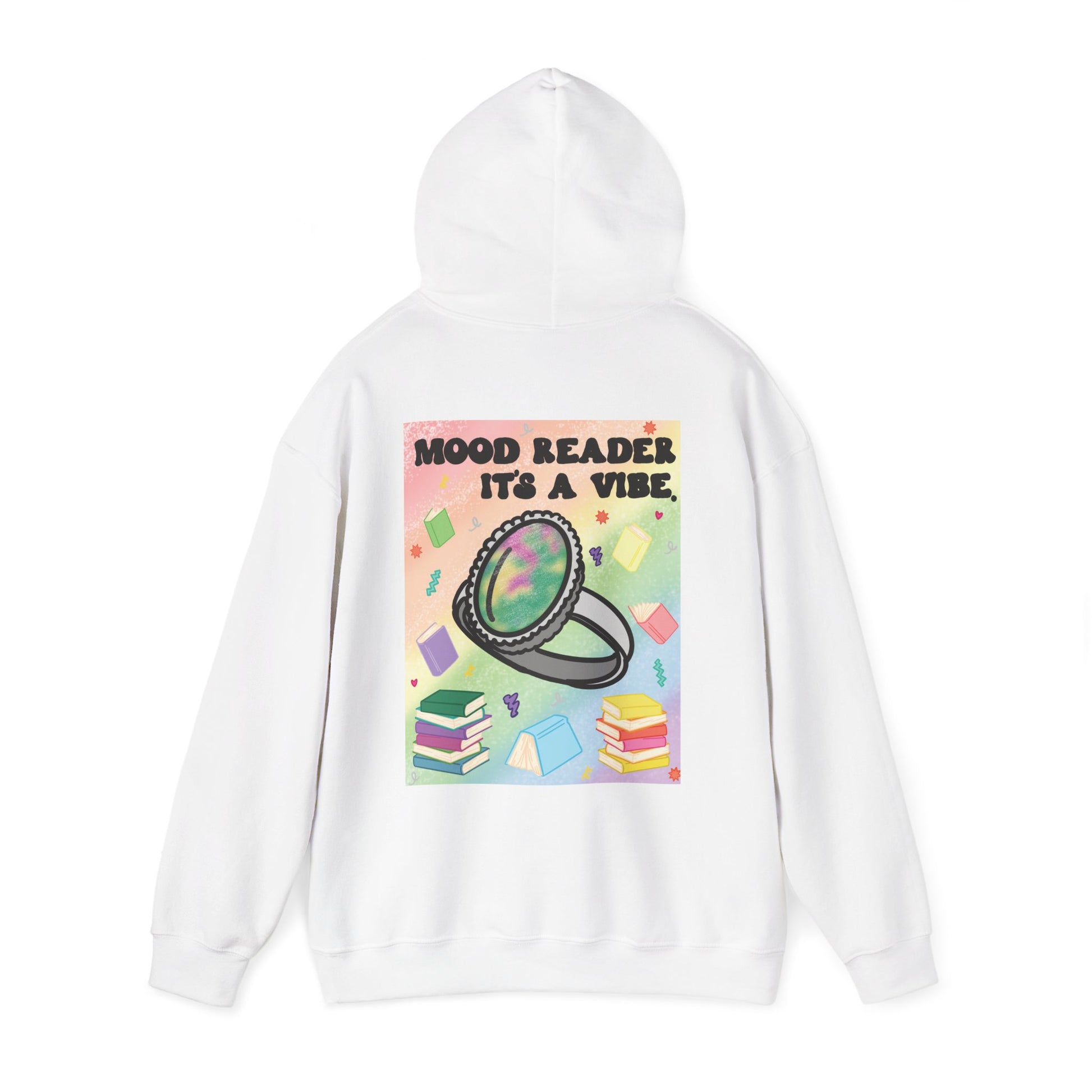 This cozy hoodie carries a playful, bookish energy — soft, warm, and slightly mischievous. A small, cheeky chest print reads “Mood Reader It’s a Vibe,” while a bold, colorful illustration on the back features a shimmering ring hovering above stacked books and floating pages. It feels like slipping into a warm corner of a café with a novel, a notebook, and a whimsical soundtrack. The medium-heavy fabric holds the print vividly and keeps its shape through chilly mornings and late-night reading sessions. Wear it when you want to broadcast quiet confidence, celebrate slow days with a favorite story, or add a splash of nostalgic color to everyday life.