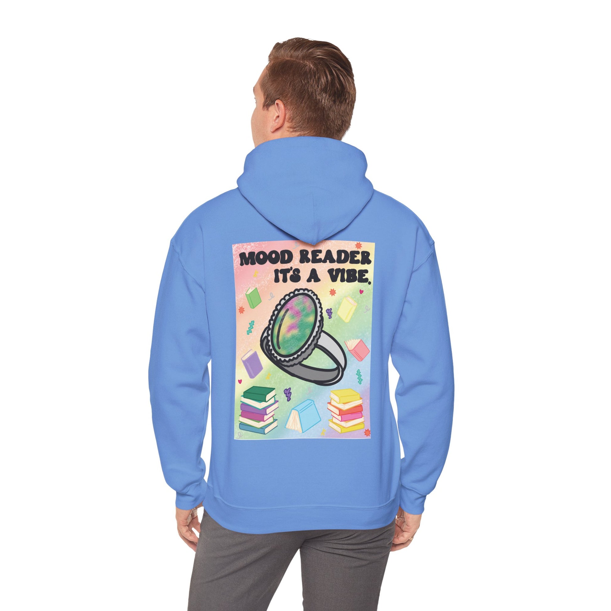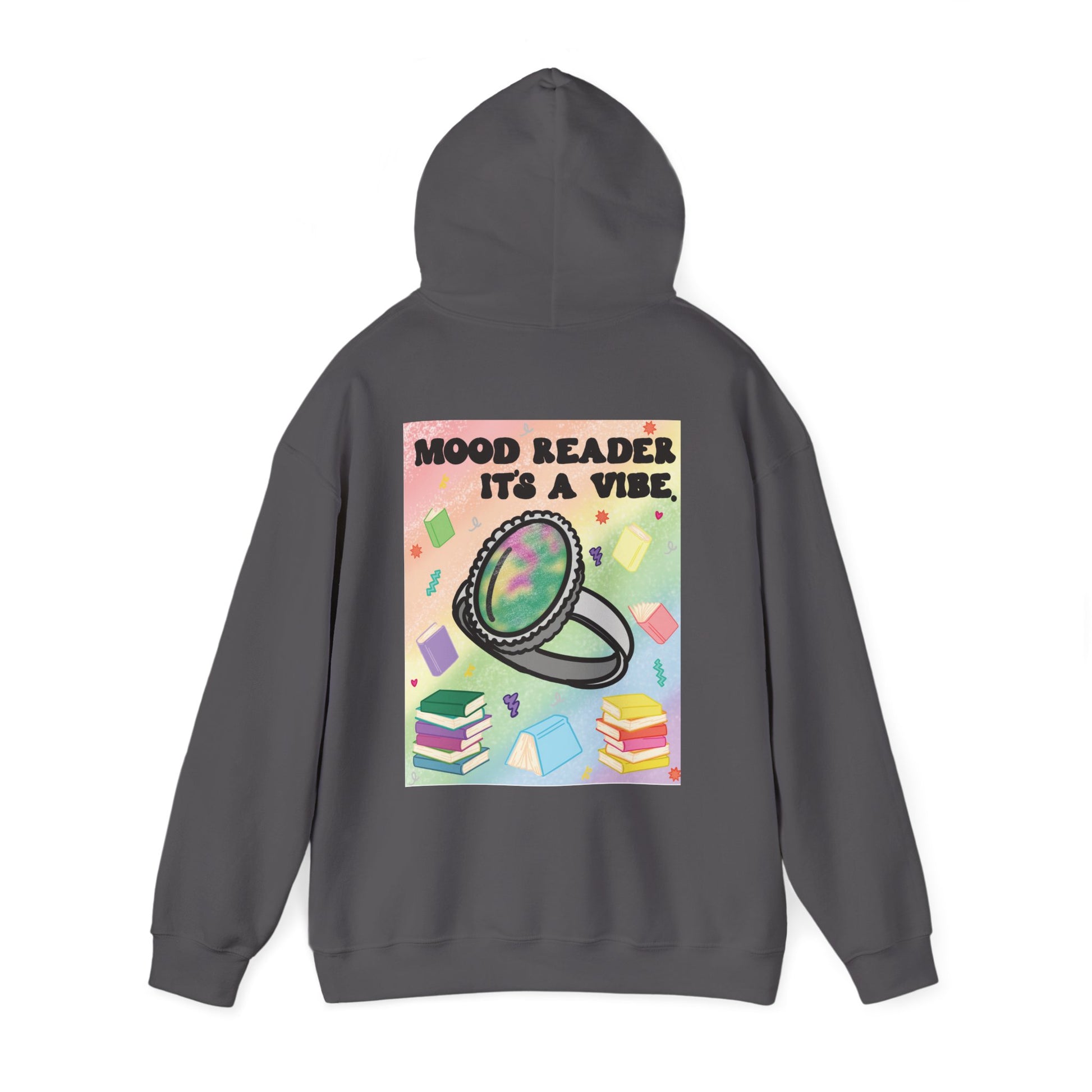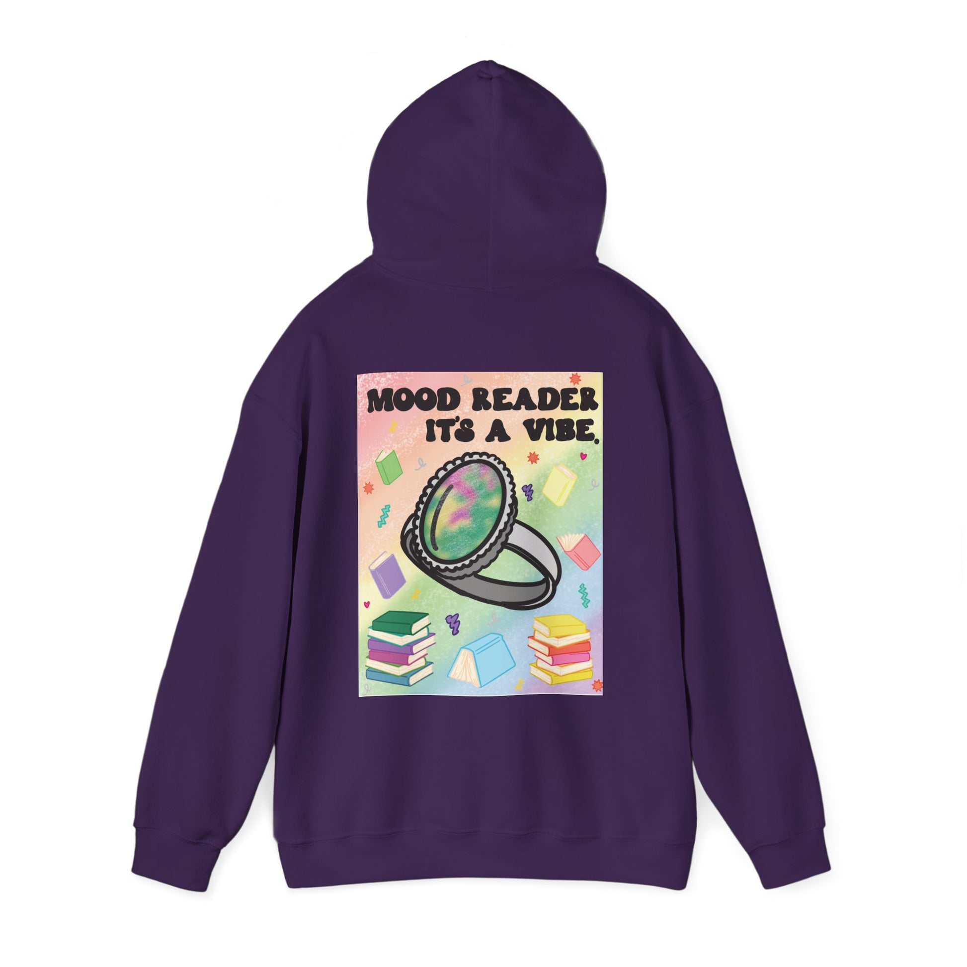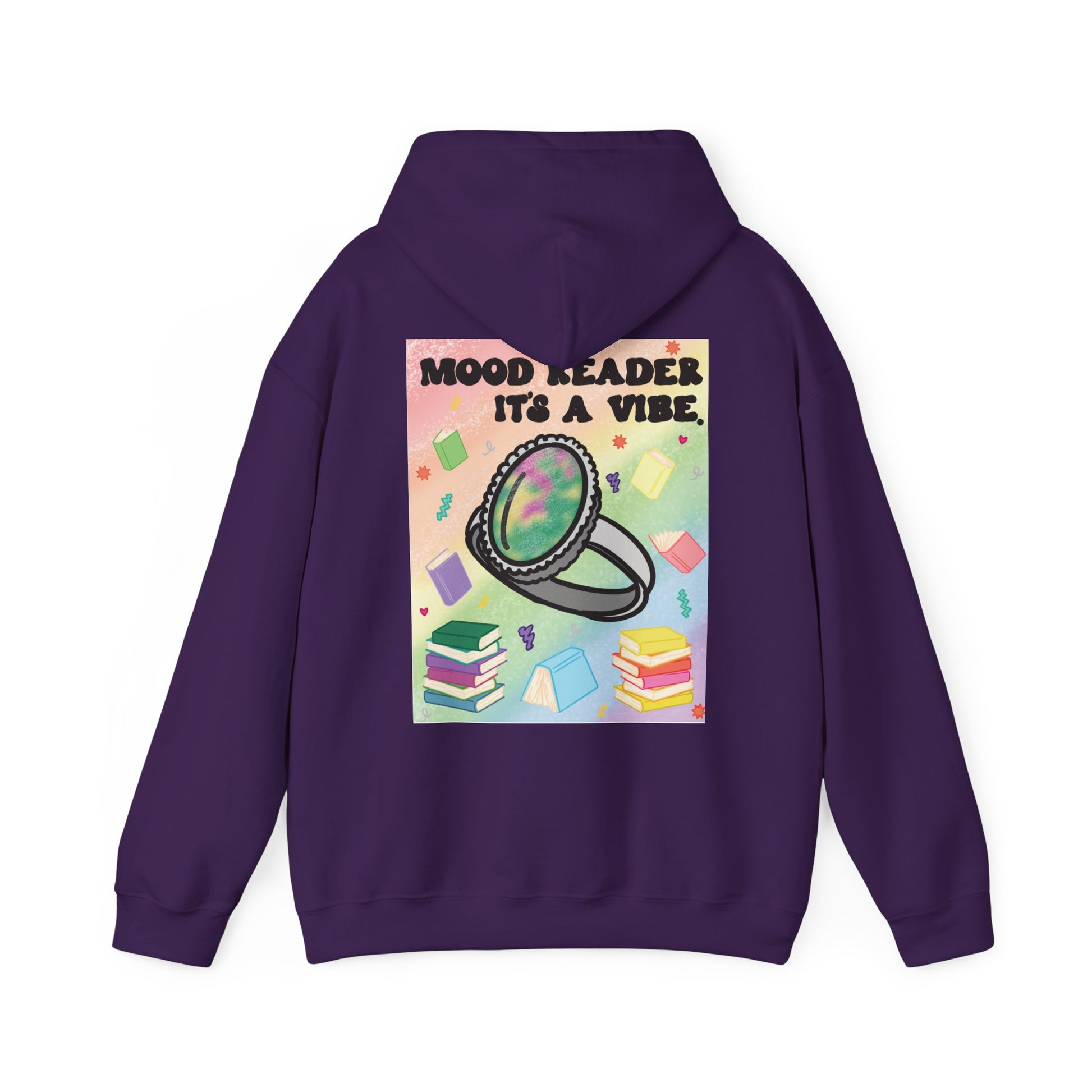 This cozy hoodie carries a playful, bookish energy — soft, warm, and slightly mischievous. A small, cheeky chest print reads “Mood Reader It’s a Vibe,” while a bold, colorful illustration on the back features a shimmering ring hovering above stacked books and floating pages. It feels like slipping into a warm corner of a café with a novel, a notebook, and a whimsical soundtrack. The medium-heavy fabric holds the print vividly and keeps its shape through chilly mornings and late-night reading sessions. Wear it when you want to broadcast quiet confidence, celebrate slow days with a favorite story, or add a splash of nostalgic color to everyday life.