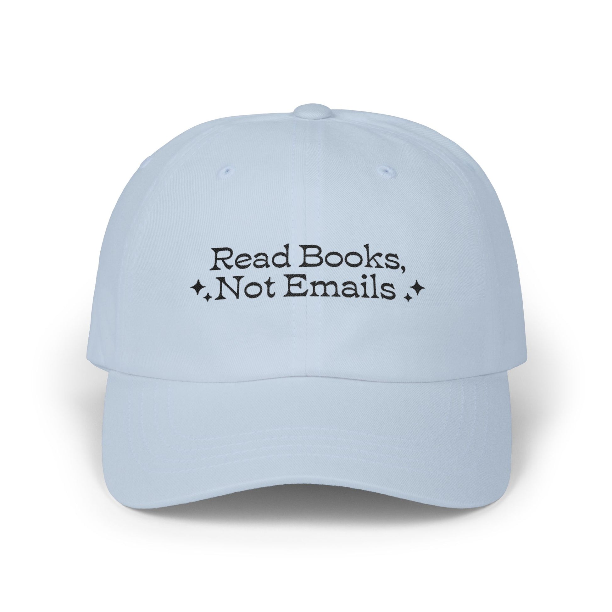 "Read Books Not Emails" - Embroidered Literary Dad Baseball Cap (Black Text)